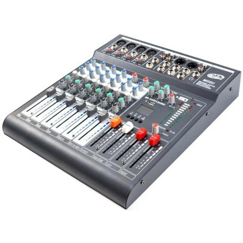 2、毎路带信号指示灯和峰值指示灯,共用可变色指示灯;带蓝牙,USB播放和录音功能,支持多种格式;内置效果器,延时和重复比例可调,组合多种效果模式;两主输出,带卡龙和RCA两种输出口,两个推子独立控制。